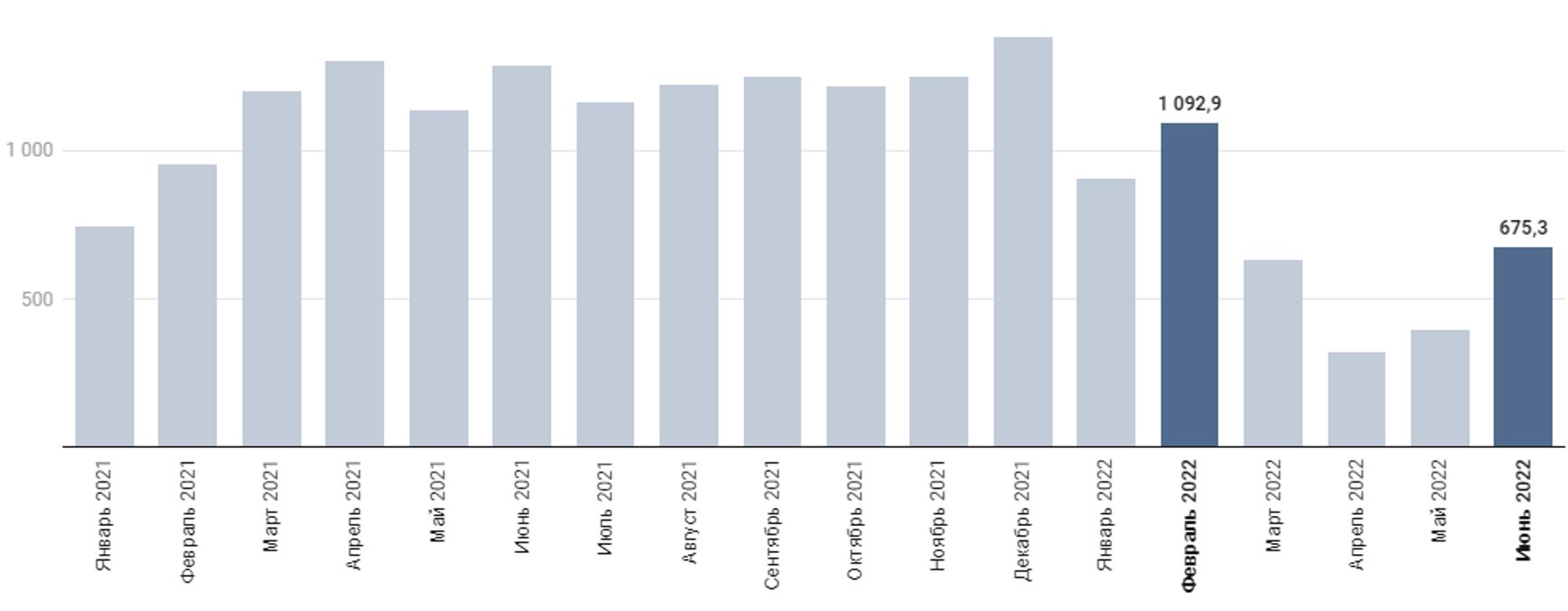 За июнь по объемам ипотеки пока официальных данных ЦБ нет, но доступны результаты мониторинга Frank RG. Они показывают, что в июне кредитование по сравнению с маем существенно оживилось, и не только ипотечное. Но если сравнивать не с провальным маем-2022, а с июнем 2021 года, ощущение коллапса возвращается. Согласно Frank RG, в июне-2022 ипотечных кредитов было выдано на 251,5 млрд, тогда как год назад было 551,4 млрд. Число выданных кредитов на жилье составило 68 тысяч, а в июне прошлого года было почти 179 тысяч. Иными словами, если в апреле-мае объем ипотечного кредитования был в 3–4 раза ниже привычного уровня, то в июне — в 2–2,5 раза, вот и все утешение. Вне сомнений в мирное время такую динамику называли бы «крахом ипотечного рынка», и она наряду с «крахом автопрома» была бы главной экономической темой.