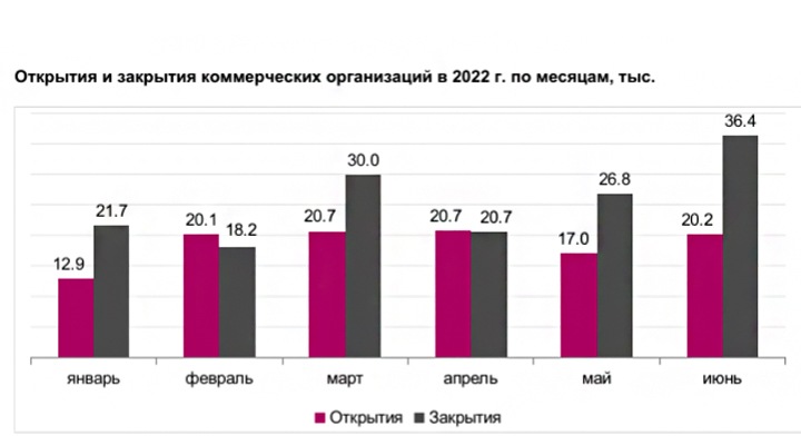 Количество закрытых с марта по июнь предприятий в России составило 113,5 тыс. Это на 17,5% больше, чем за тот же период 2021 года и на 30% больше, чем открылось. Из Сибири в десятке регионов с наименьшей долей открытых компаний относительно закрытых оказалась Томская область. Вместе с тем в Бурятии, Хакасии, Туве, Забайкалье и Омской области фирмы открывались чаще, чем закрывались.