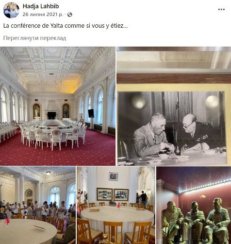 Также она выложила в Facebook фотографии из Ливадийского дворца с экспозицией о Ялтинской конференции и дачи Чехова в Ялте. Эти сообщения опубликованы 26-28 июля.