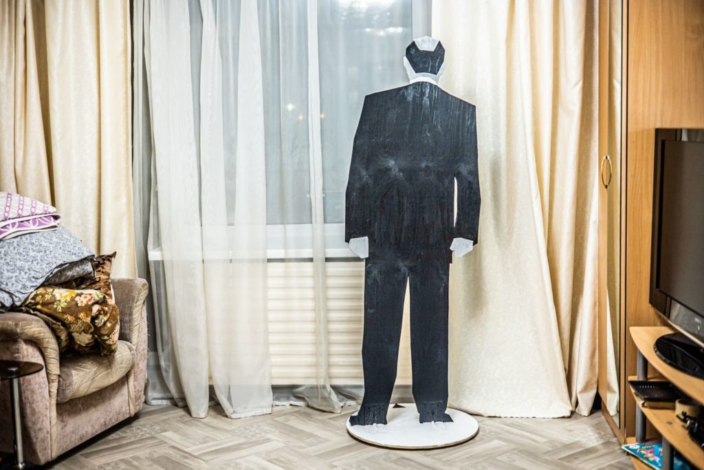Рисовали с другом несколько дней, фигуру на стене высвечивали с помощью проектора, потом краской обводили линии. Пока рисовали, познакомились с бабушкой, которая живёт в этом доме. В этот дом её поселили 30 лет назад «на пару недель», когда она начала работать дворником. Сказали, что скоро дадут постоянную квартиру. Но она уже вышла на пенсию — и до сих пор живёт там. Окна в доме заколочены, разваливаются перекрытия и крыша, жёлтая краска на фасаде давно облупилась. Дом выглядит нежилым.