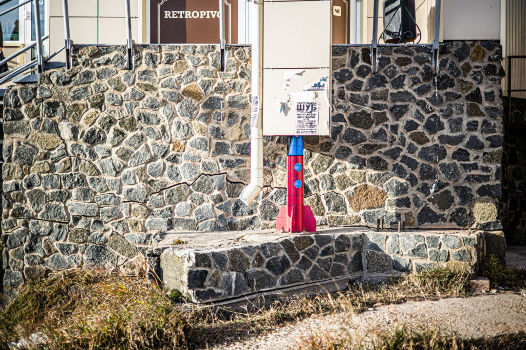 В центре Братска стоит здание заброшенного советского магазина электротоваров. Арендаторов для него найти не могут, помещения пустуют. На двери табличка «Продаётся». Серая краска на фасаде местами облупилась и обвалилась вместе с кусками штукатурки. В августе прошлого года Гриша Шаров наклеил на самую большую дыру огромные лейкопластыри, вырезанные из баннерной ткани.