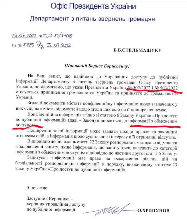 В ведомстве подтвердили, что неопубликованные указы президента №502 и №503 касаются прекращения гражданства Украины и принятия в гражданство Украины. В ответе на запрос указано, что соответствующие указы содержат конфиденциальную информацию об указанных в них лицах, при этом "сведений о согласии этих лиц на ее распространение нет".
