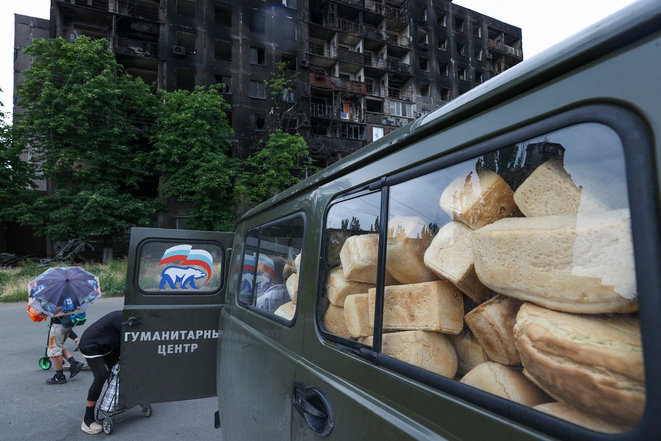 Before long, United Russia began opening party-branded “humanitarian centers” in the self-proclaimed Donetsk and Luhansk “People’s Republics” and other Russian-occupied Ukrainian territories. The centers serve as bases for United Russia representatives to distribute humanitarian aid (including groceries, medication, and SIM cards with Russian numbers) in an effort to win local residents’ loyalty. One of the first centers opened in Mariupol on March 24 — almost two months before Russian forces fully captured the city. In the second half of July, Turchak reported that over thirty centers had been opened in the city.