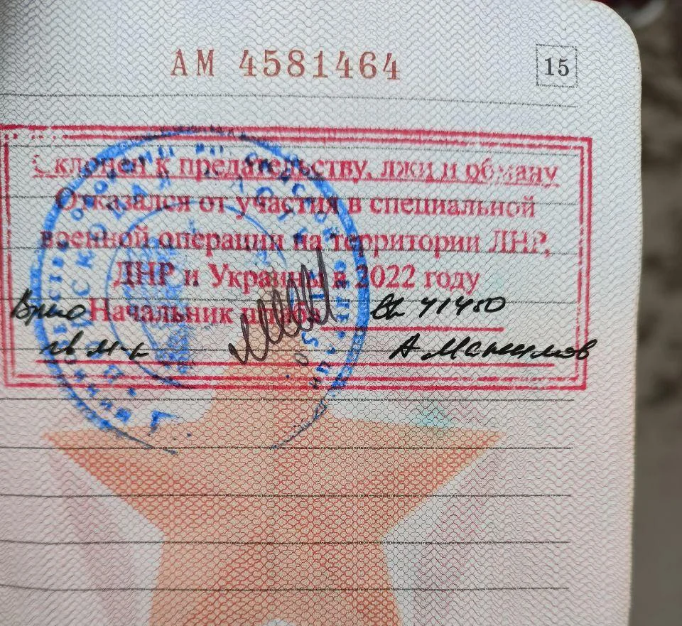 Рядовому поставили в военный билет красный штамп: Склонен к предательству, лжи и обману. Отказался от участия в специальной военной операции на территории ЛНР, ДНР и Украины в 2022 году».