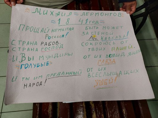 2В центре Москвы у гостиницы Four Seasons задержали Винера Лукманова, который вышел на одиночный пикет с плакатом, где было процитировано стихотворение Михаила Лермонтова «Прощай, немытая Россия». Об этом Лукманов сам сообщил ОВД-Инфо.