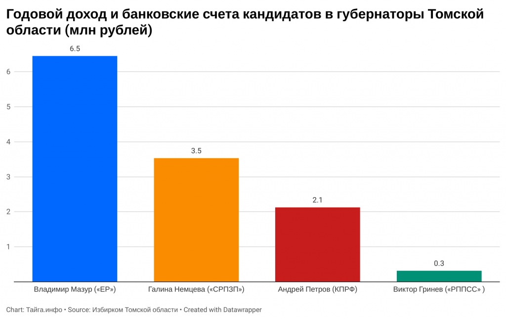 Избирком Томской области зарегистрировал четырех кандидатов на пост главы региона. За кресло поборются недавно назначенный Кремлём врио губернатора Владимир Мазур («Единая Россия») и вице-спикер гордумы Томска Андрей Петров (КПРФ). Также в бюллетене будут директор ООО «Агенство юридических услуг „Азбука права“» Виктор Гринев (РППСС) и депутат регионального парламента Галина Немцева («СРПЗП»).
