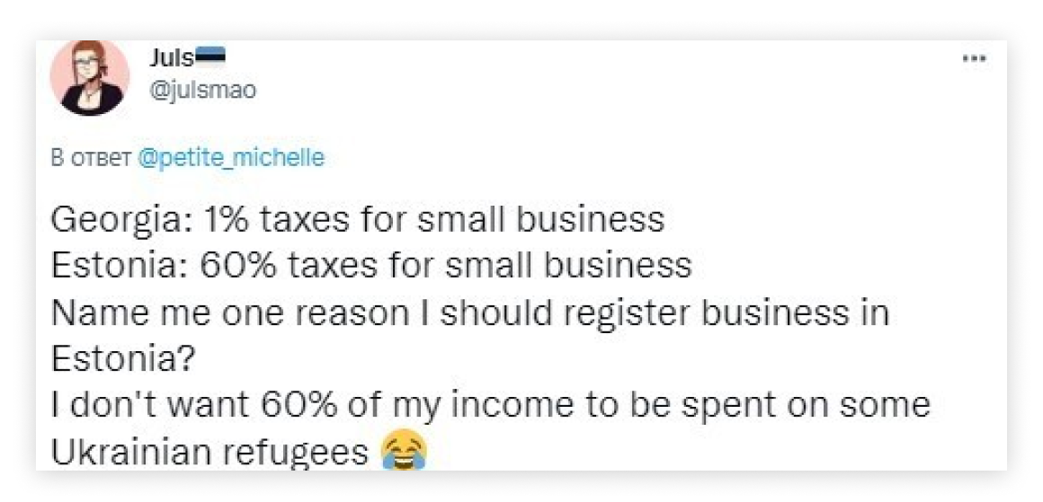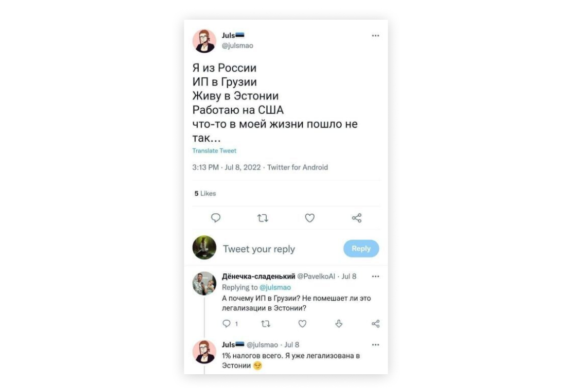 Героиня этой захватывающей истории уже скрыла свой Твиттер-аккаунт под замок. Но историю можно восстановить по сохранившимися в открытом доступе скриншотам из статьи Medialeaks. Суть истории в том, что айтишница Юлия в своем аккаунте в Твиттере рассказала, как совсем недавно эмигрировала в Эстонию и получила там ВНЖ, но при этом продолжала работать на компанию из США, которая платила ей на ИП в Грузии.