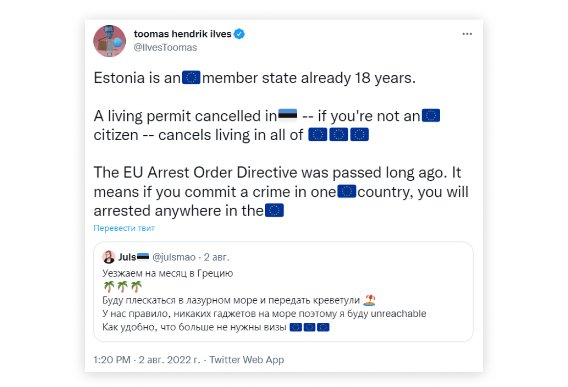 Вскоре Юлия затвитила, что уехала с семьей на месяц в Грецию – что очень удобно, ведь теперь «больше не нужны визы». В ответ на это Тоомас пояснил, что согласно законам Евросоюза, при совершении преступления в одной стране ЕС человек может быть арестован в любой другой стране Евросоюза.