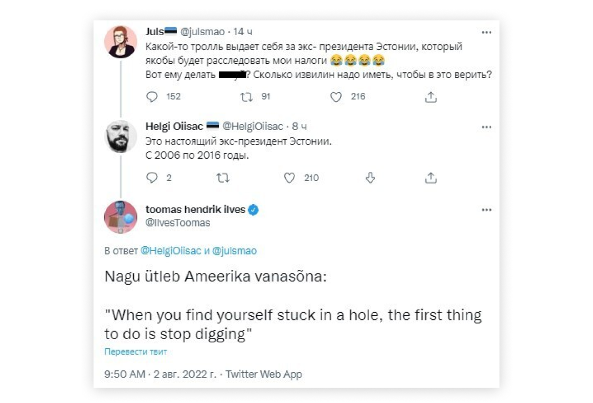 Все было хорошо, но в какой-то момент в комментарии пришел бывший президент Эстонии Тоомас Хендрик Ильвес (Юлия в это, впрочем, поначалу не поверила).