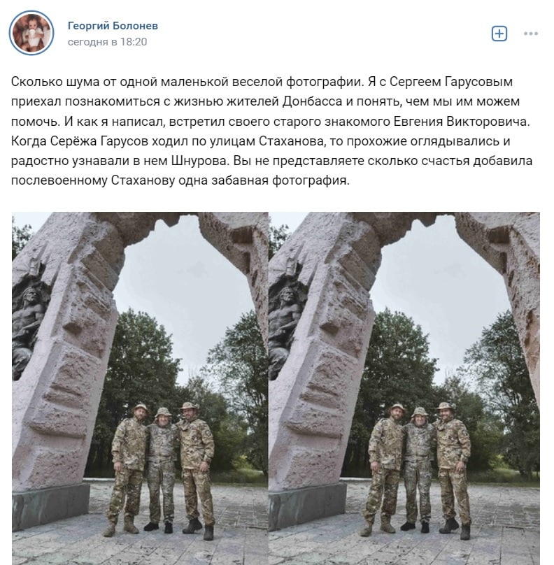 Позднее Болонев сам признал, что на снимке на самом деле запечатлен не Шнуров, а его знакомый Сергей Гарусов, который якобы похож на музыканта. «Когда Сережа Гарусов ходил по улицам Стаханова, то прохожие оглядывались и радостно узнавали в нем Шнурова», — написал он.