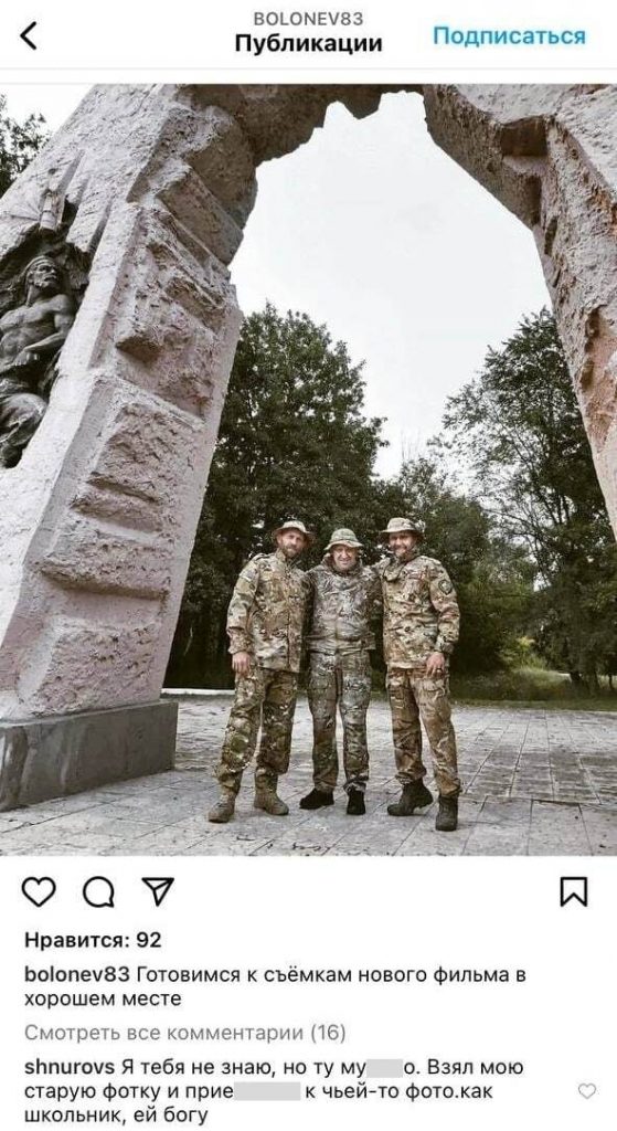 Фото Болонева было подписано: «Нахожусь в прекрасном месте. Готовимся к новому фильму». На нем присутствовал сам актер, бизнесмен Евгений Пригожин и якобы Сергей Шнуров.