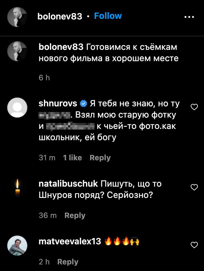 Сам Шнуров при этом в комментарии к посту Болонева в инстаграме заявил, что его изображение на фото — подделка. Он также заявил, что якобы не знает выложившего фото актера.