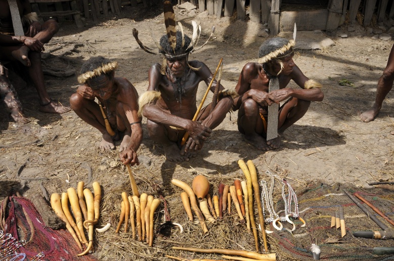 Папуа-Новая Гвинея. Мужчины из племени дани продают туристам котеки (футляры для пениса)