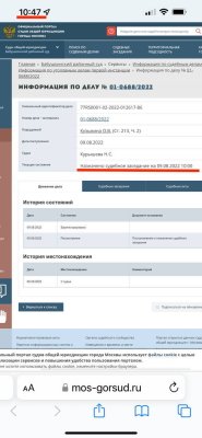 Адвокат Тертухина предоставила скриншоты с официального портала судов общей юрисдикции Москвы, которые подтверждают, что в 9:02 и 9:37 заседание по делу Кузьминой еще не было назначено. Однако на скриншоте, сделанном в 10:47, видно, что рассмотрение дела назначили на 10:00.