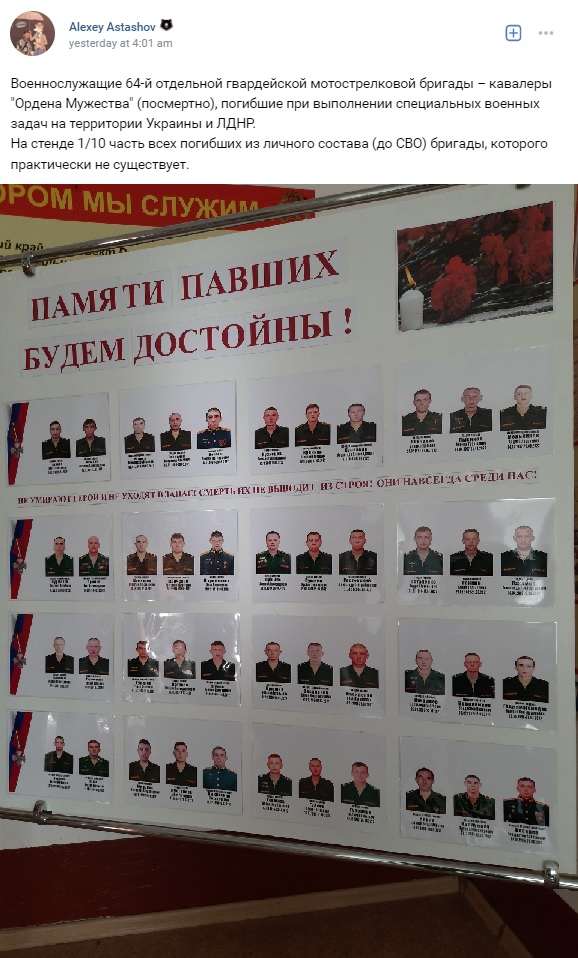 "На СВО поехали все, кроме девчонок, штабных мышей и новобранцев. 95% офицерского состава, контрактников, в том числе "полусрочников", подписавших контракт "на коленке" перед выездом". Многие были переброшены в Украину прямо с учений в соседней Беларуси", – написал военный врач журналисту Радио Свобода. На стенд, как говорит Асташов, попали только те солдаты и офицеры, которые были посмертно награждены орденом Мужества (он изображен слева от каждого ряда фотографий). Общее число погибших военнослужащих 64-й бригады Асташов оценивает как минимум в несколько сотен.