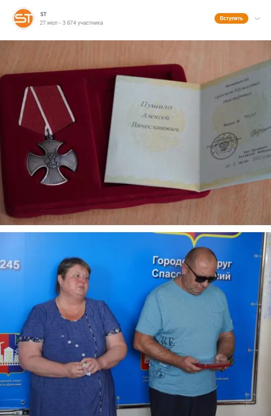 Пушило Алексей Вячеславович, 21.10.1990 – 25.04.2022. Сообщение о смерти во "ВКонтакте", фотографии передачи родителям ордена Мужества.