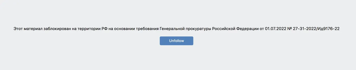 Поводом для блокировки стали «информационные материалы, содержащие недостоверную общественно значимую информацию о проводимой ВС РФ специальной военной операции, ее форме, способах ведения боевых действий, а также информацию об атаках на объекты гражданской инфраструктуры, многочисленных жертвах среди гражданского населения Украины и в рядах ВС РФ, относительно всеобщей мобилизации и другие».