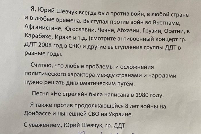 Шевчук мог присутствовать на заседании по видео-конференц-связи из суда Петербурга, сообщала объединенная пресс-служба судов города. Но музыкант не пришел. Его позицию озвучил адвокат Александр Передрук, рассказал Чиков. Шевчук подчеркнул, что всегда был против войн — в любой стране и в любые времена. «Считаю, что любые проблемы и осложнения политического характера между странами и народами нужно решать дипломатическим путем», — отметил он.