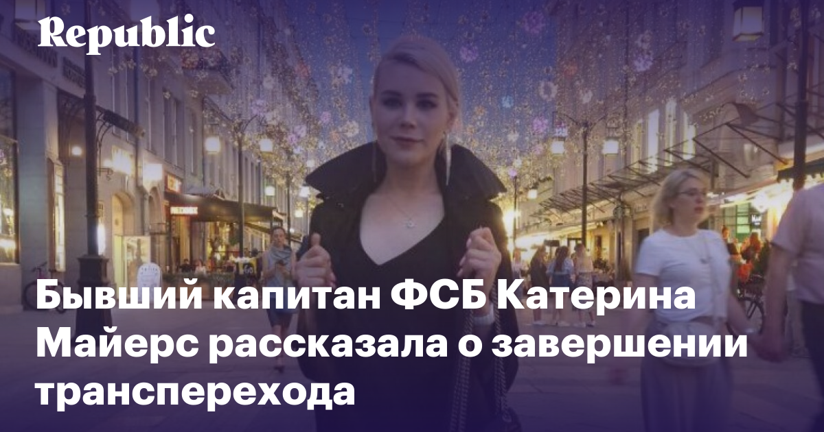 31-летняя уроженка Читы Катерина Майерс, в прошлом капитан ФСБ Александр Чумаков, сообщила, что полностью завершила трансгендерный переход. Republic рассказывал ее историю в январе — тогда Майерс сделала публичный каминг-аут, заявив о себе как о женщине, и рассказала о решении «начать жить свою жизнь».