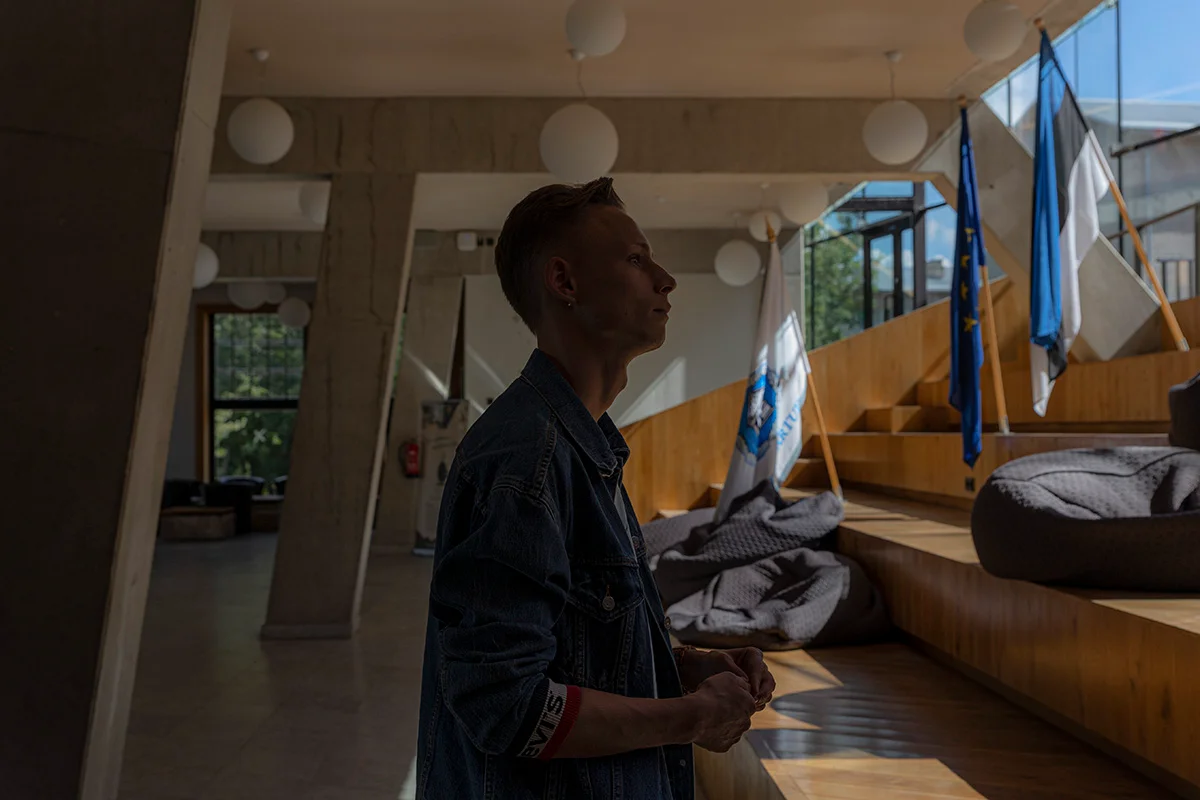 Денис, выглядящий намного моложе своих 29 лет и совсем не похожий на депутата в привычном для России понимании, даже внешне отличается от людей, пришедших защищать танк. Невысокий худой блондин с уложенной прической, идеальной кожей с легким загаром, сережками-гвоздиками в ушах, стильно одетый. Мы встречаемся в Нарвском колледже Тартуского университета.