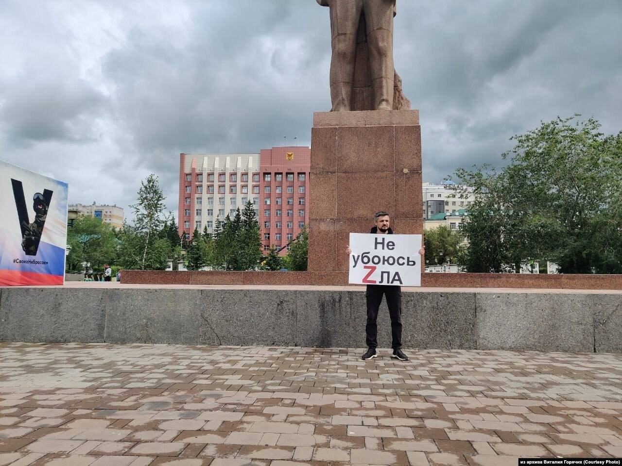 Читинец Виталий Горячих с 2018 года выходит на митинги и пикеты, где открыто выступает против коррупции, роста цен, а с недавних пор и войны в Украине. 28 июля он вышел в центр города, держа плакат с библейской цитатой "Не убоюсь Zла". Спустя два часа его задержали сотрудники полиции, обвинив в "дискредитации" российской армии, а через 3 недели суд выписал штраф в 30 тысяч.