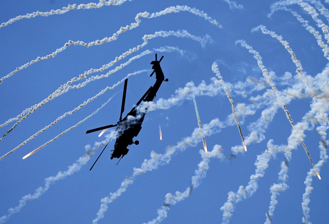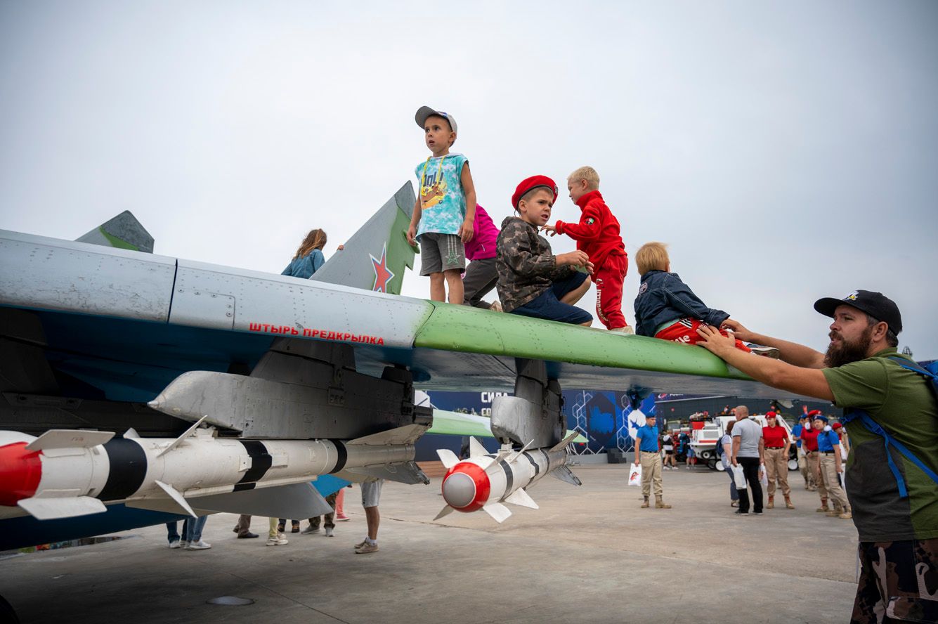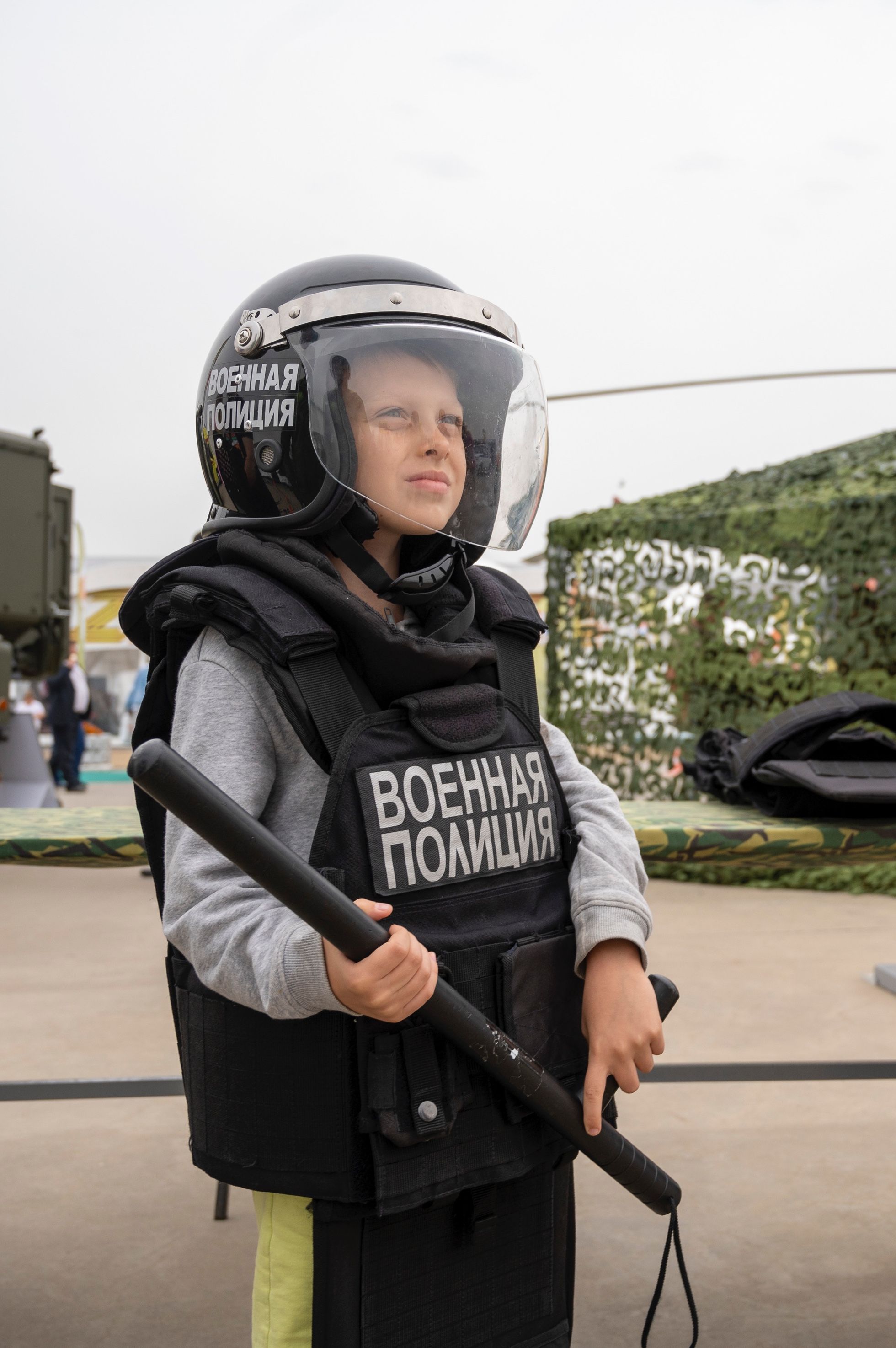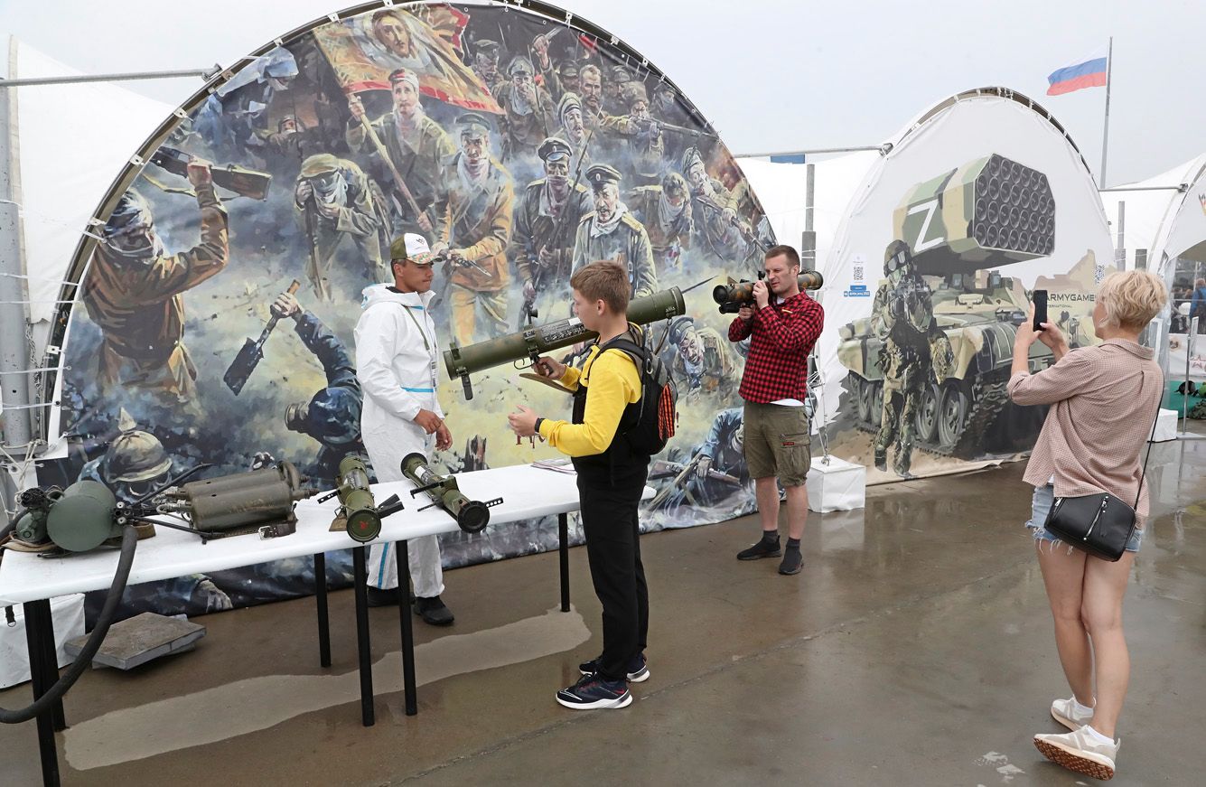 Pavel Pavlov / Anadolu Agency / ABACAPRESS / ddp images / Vida Press Вертолет Ми-28 выполняет фигуры высшего пилотажа и отстреливает тепловые ловушки, призванные обмануть зенитные ракеты. В войне с Украиной документально подтверждены потери от огня ПВО семи вертолетов этого типа«Медуза» Дети на крыле истребителя. Под крылом — макеты ракет «воздух — воздух»«Медуза» Новейший многоцелевой истребитель пятого поколения Су-57. Российская промышленность смогла произвести лишь несколько таких машин, две были потеряны при испытаниях. Как утверждает Минобороны РФ, самолеты приняли участие в войне в Украине и «показали себя отлично»Pavel Pavlov / Anadolu Agency / ABACAPRESS / ddp images / Vida Press Пилотажная группа на истребителях Су-35. В войне с Украиной подтверждена потеря одного подобного истребителя«Медуза» Мальчик на интерактивном тренажере, имитирующем прыжок с парашютом«Медуза» Мальчик рассматривает артиллерийские снаряды, боеприпасы к мелкокалиберным пушкам и пулеметамMaxim Shemetov / Reuters / Scanpix / LETA Показательные стрельбы из тяжелого 240-миллиметрового миномета «Тюльпан». Такие минометы советского производства активно применяются в войне в Украине, в частности, одна из установок обстреливала завод «Азовсталь» во время его осады«Медуза» Сувениры для детей: камуфляжные футболки, в том числе с символикой российского вторжения в Украину«Медуза» Мальчику показывают натуралистичную экспозицию, посвященную военно-медицинской службе. Предлагается «оказать помощь» манекену с оторванной ступнейMaxim Shemetov / Reuters / Scanpix / LETA Полигон для показательных стрельб, огонь ведут танки и боевые машины пехоты (БМП). Документально во время боевых действий в Украине подтверждены потери 968 российских танков и 505 БМП (включая разведывательные)Yuri Kochetkov / EPA / Scanpix / LETA Инсталляция, созданная из остатков 155-миллиметровой американской гаубицы М777, захваченных российской армией в УкраинеGetty Images Созданная по заказу Минобороны России инсталляция, показывающая «нацистское образование» в Украине Maxim Shemetov / Reuters / Scanpix / LETA Танк Т-72 с узбекским экипажем во время соревнований по «танковому биатлону»Maxim Shipenkov / EPA / Scanpix / LETA Подросток фотографируется с макетом ручного противотанкового гранатомета«Медуза» Дети фотографируются с автоматом