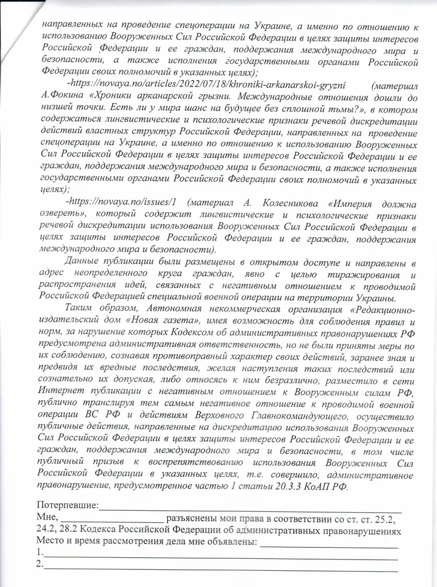 «Кульминацией статьи <…> явилось демонстрируемое авторское отношение к проводимой Вооруженными силами Российской Федерации спецоперации на Украине через критику правоохранительных органов».