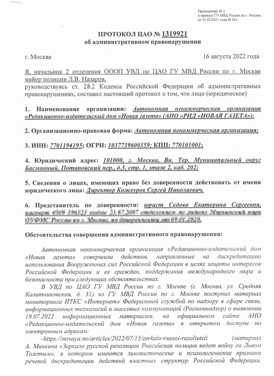 Судя по документам, поступившим в суд, проверка закончилась на том, что к делу была приобщена доверенность юриста редакции. Заключения экспертов, как можно было понять из разговора, полицейские не читали и что случилось, в принципе не представляли. Тем более что статьи были опубликованы на нашем к тому времени уже заблокированном сайте (novaya.no) — ну не VPN же устанавливать… Узнать фамилии лингвистов и психологов тоже не удалось —