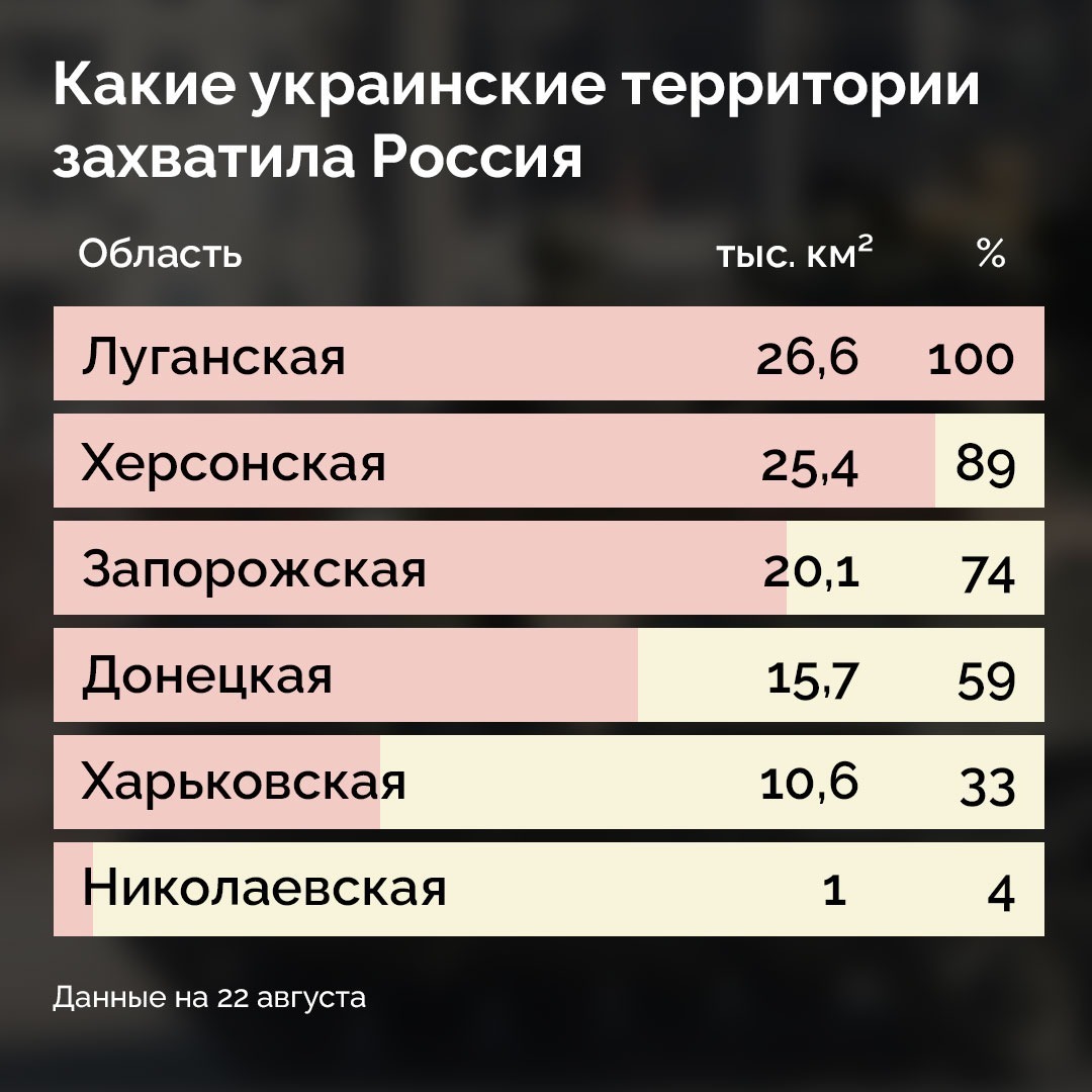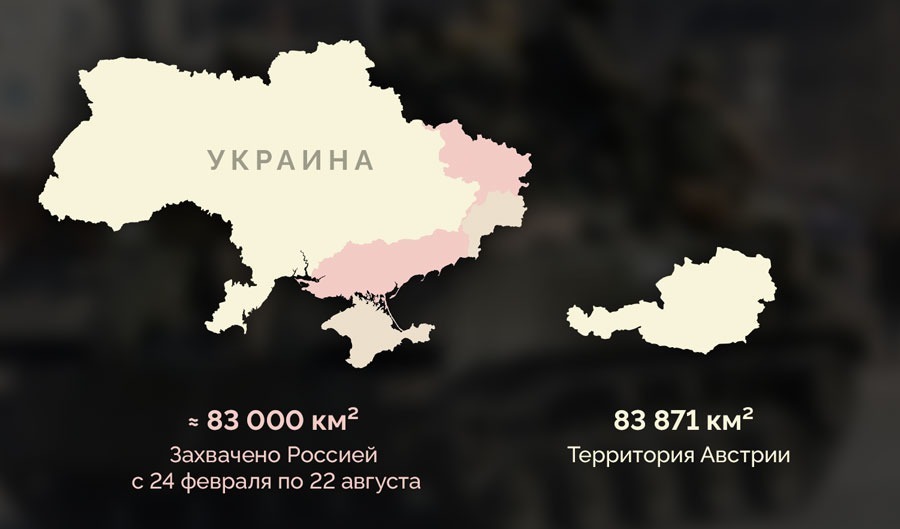- С 24 февраля Россия захватила около 83 тысяч кв.км украинской территории, следует из расчетов «Агентства». Это сопоставимо с площадью Австрии (83,8 тысячи кв.км) или Чехии (78,8 тысячи кв.км).