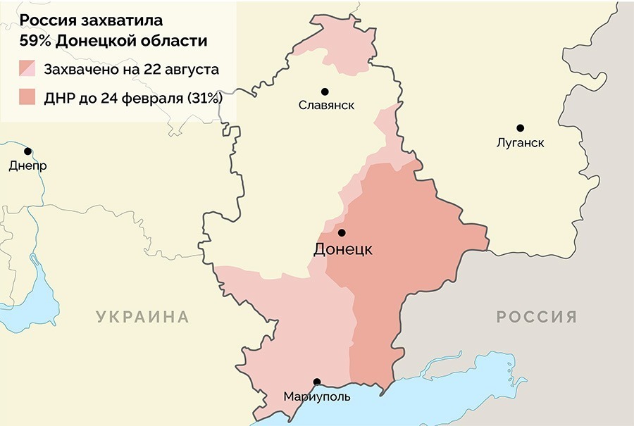 - Деталь: Российская армия не может взять под контроль Донецкую область, хотя «освобождение» регионов Донбасса называли своей целью и Владимир Путин, и армейское начальство. За полгода Россия захватила 7,45 тысячи кв.км, или 28% области. До 24 февраля территория ДНР занимала 8,2 тысячи кв.км, или 31% от области. Таким образом сейчас Россия контролирует 59% территории региона. При этом Россия смогла взять под контроль всю Луганскую область.