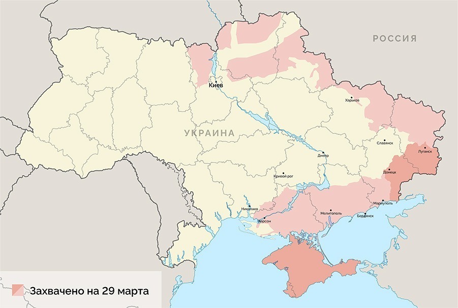 - Через месяц после начала войны, 29 марта, Россия контролировала намного больше – 165 тысяч кв.км.