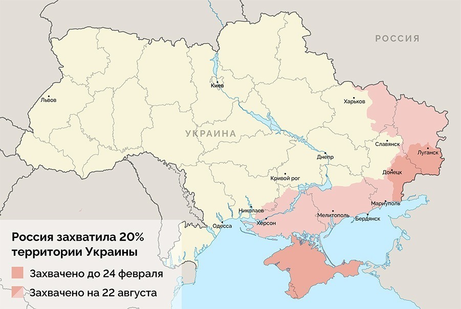 - С учетом ранее присоединенного Крыма, а также самопровозглашенных Донецкой и Луганской республик Россия сейчас контролирует более 125 тысяч кв.км украинской территории, то есть примерно 20% Украины.