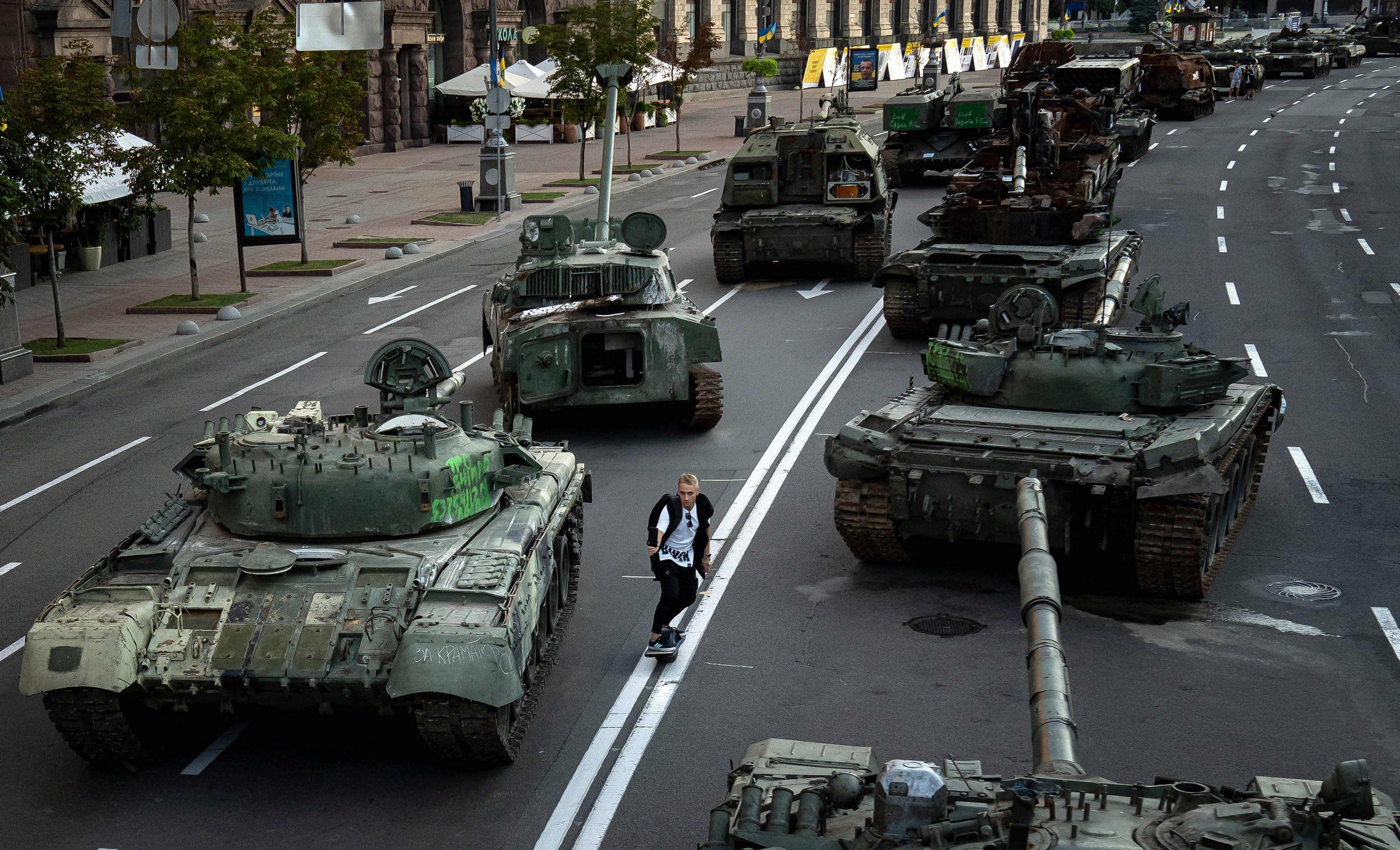 Уничтоженная российская военная техника в центре Киева, 24 августа 2022 г. Фото: Evgeniy Maloletka / AP