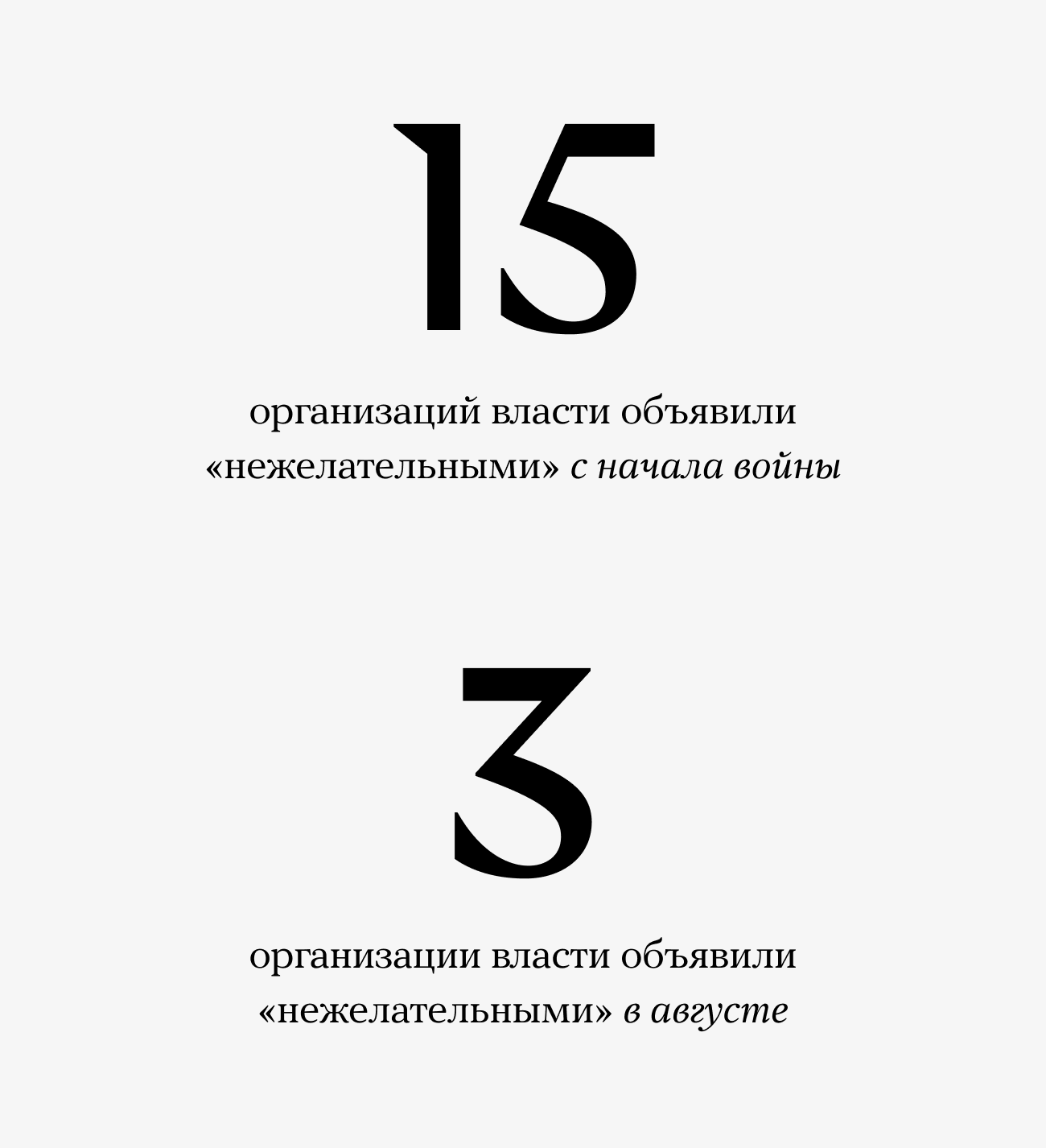 В августе Министерство юстиции РФ, видимо, ушло в отпуск — и в реестрах «иноагентов» не появилось новых имен и названий организаций. Однако за этот месяц прокуратура потребовала ликвидировать «Профсоюз журналистов» за неисполнение требований «иноагентского» законодательства, а суд начал процедуру банкротства «Радио Свобода» из-за невыплат штрафов за отсутствие «иноагентских» маркировок.
