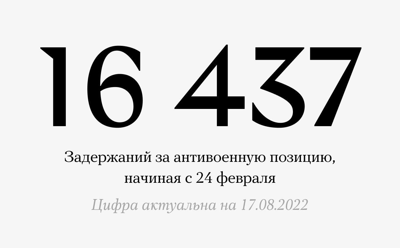 Известно как минимум о 16 437 задержаниях, связанных с антивоенными протестами с 24 февраля по 17 августа. В это число, помимо уличных задержаний, входят 138 задержаний за антивоенные посты в соцсетях, 118 задержаний за антивоенную символику и 62 задержания после антивоенных акций.