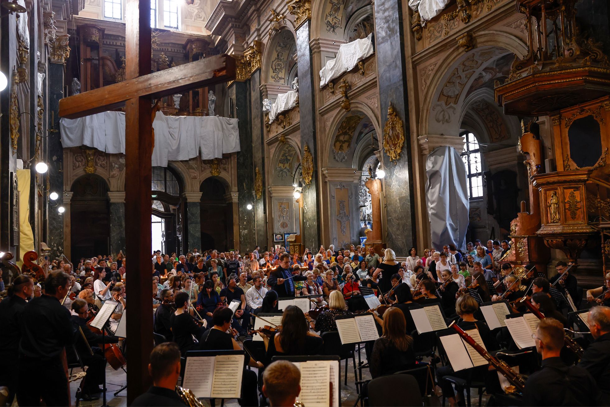 Накануне Дня независимости Украины и полугода с начала полномасштабного вторжения в страну во Львове прошел симфонический концерт. В Киеве начался чемпионат страны по футболу — на пустом стадионе сыграли донецкий «Шахтер» и харьковский «Металлист». В Харькове, который продолжают обстреливать, открыли новые бомбоубежища на остановках. В Донецке под обстрел попало здание администрации самопровозглашенной ДНР, гостиница и многоквартирный дом. «Медуза» публикует главные фотографии сто восемьдесят первого дня войны.