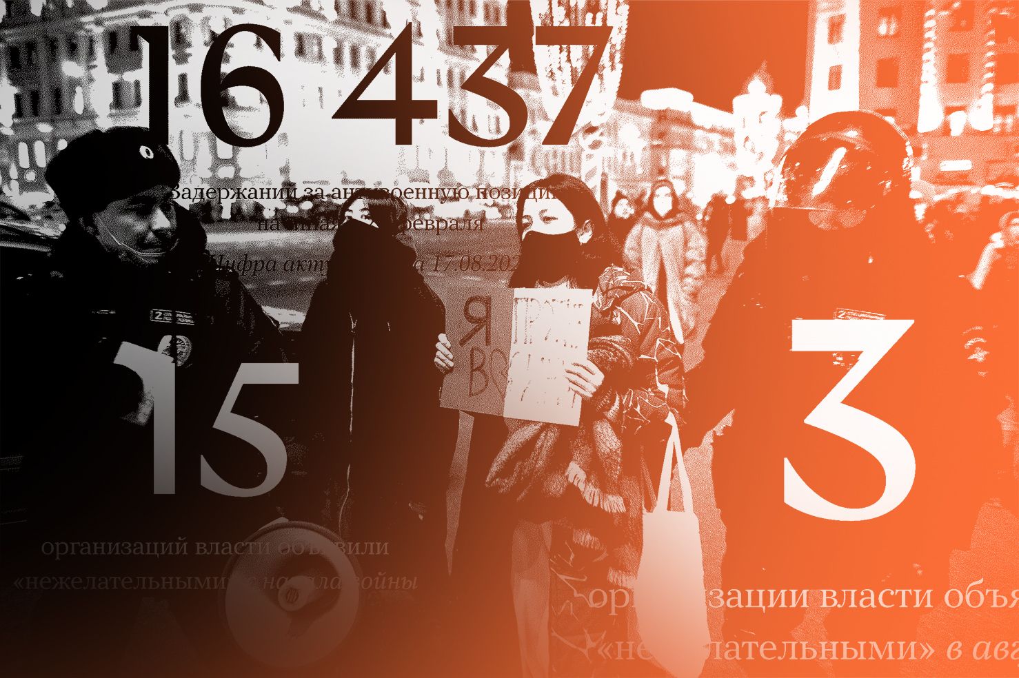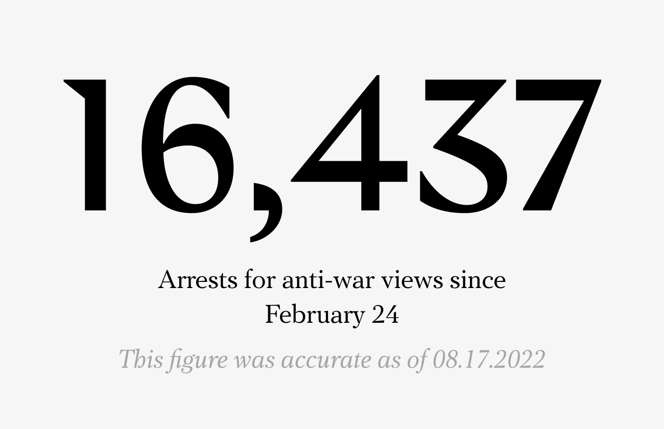 OVD-Info recorded at least 16,437 arrests in connection with anti-war protests between February 24 and August 17, 2022. In addition to arrests carried out at street protests, this figure includes 138 arrests for anti-war posts on social media, 118 arrests for anti-war symbols, and 62 arrests carried out after anti-war demonstrations.