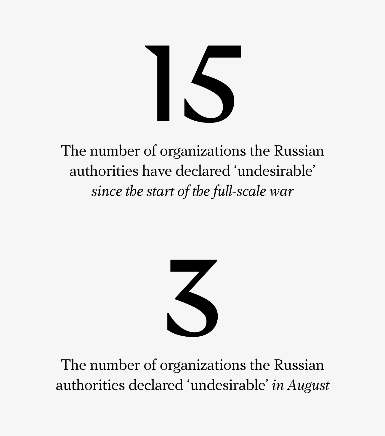 Since OVD-Info published its July report on anti-war repressions, three more organizations have been declared “undesirable”: The Ukrainian Canadian Congress, The Macdonald-Laurier Institute, and the Ukrainian National Federation of Canada. There are now 65 organizations on Russia’s “undesirable” blacklist.