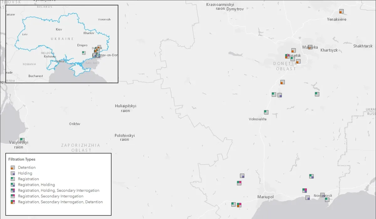 В исследовании говорится, что помещения используются для регистрации, допросов и задержаний мирных жителей Украины, украинских военнопленных и других лиц на территориях, оккупированных Россией и ее «ставленниками». Ученые выделили четыре основных типа объектов инфраструктуры фильтрации: