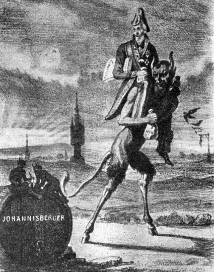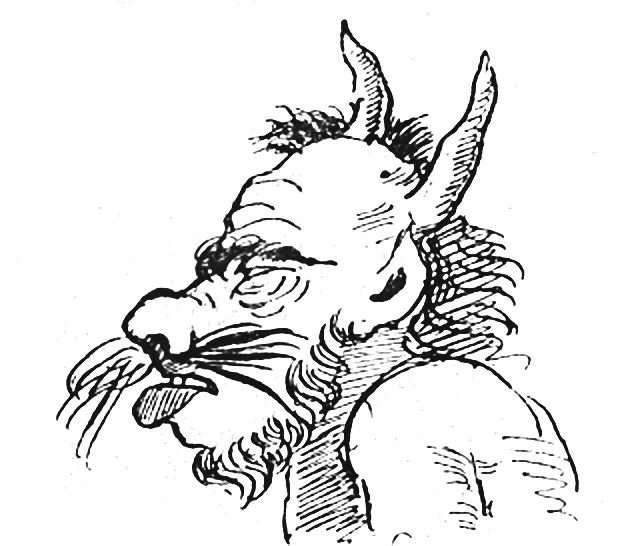 Лакированные ботинки скрывали копыта, фрак — хвост, цилиндр — рога, во рту у него была толстая сигара, из кармана вываливались зеленые доллары.