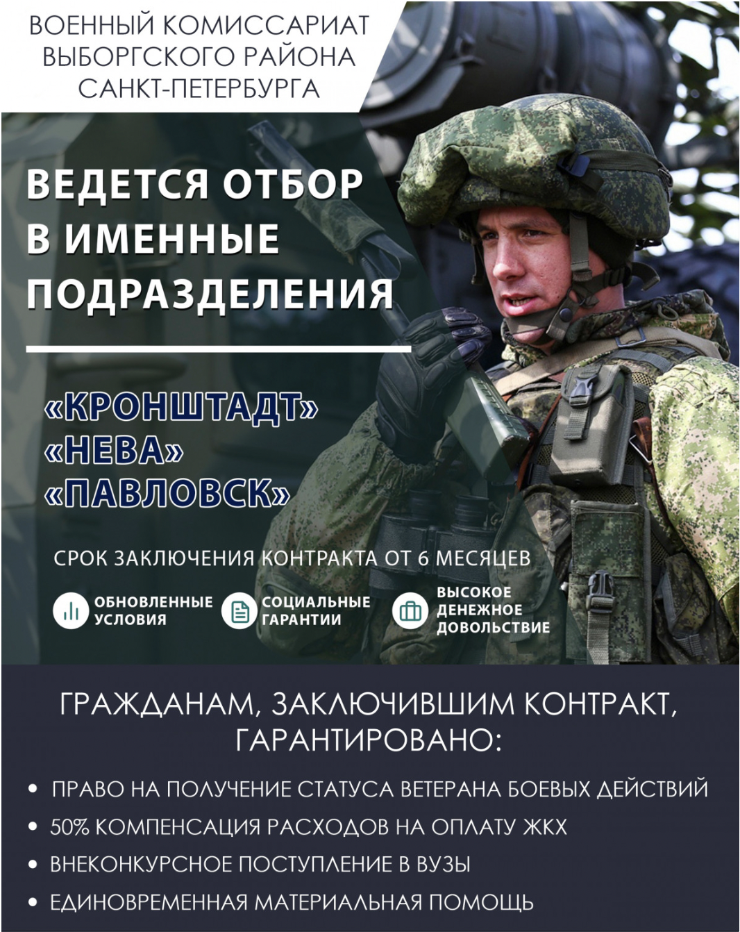 Согласно объявлению о наборе добровольцев в именные подразделения, заключить контракт приглашают совершеннолетних петербуржцев. Им обещают единовременные выплаты, компенсацию оплаты ЖКХ, право на получения статуса ветерана боевых действий и поступление в вузы вне конкурса.