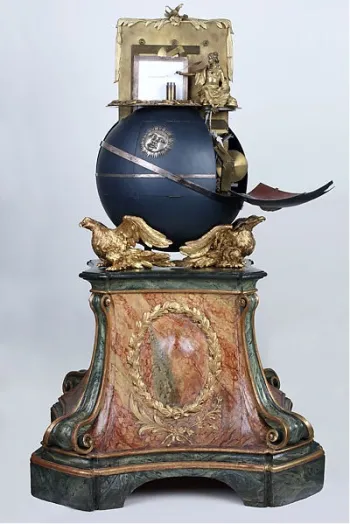 Мастер без устали совершенствовал свои изделия. Один из последних автоматов Кнауса представлял внушительное произведение искусства, установленное на деревянном пьедестале высотой около двух метров, в центре которого располагалась металлическая сфера диаметром около 80 см с механизмом внутри. Вся конструкция покоилась на двух бронзовых орлах. Сфера была изготовлена из чугуна и первоначально покрыта золотом, а сетка линий меридианов выложена серебром. Над сферой, на платформе в виде облака, сидела фигурка античной богини. Она сжимала в руке перо, которое временами макала в чернильницу и писала слова на закрепленном на доске листе бумаги. Специальный механизм, расположенный позади величественной статуи, перемещал доску влево после каждой написанной буквы; когда строка заканчивалась, доска двигалась одновременно в горизонтальном и вертикальном направлениях. Механизм, спрятанный в сфере, представлял собой горизонтальный ролик, или цилиндр, состоящий из штифтов, введенных в соответствующие отверстия. При перемещении штифты нажимали клавиши на своеобразной клавиатуре, каждая клавиша соответствовала определенной букве. Автомат был способен написать 107 слов примерно за пятнадцать минут. В общем, Фридрих фон Кнаус изобрел автоматическую автономную печатную машинку, которая набирала заранее запрограммированный текст.