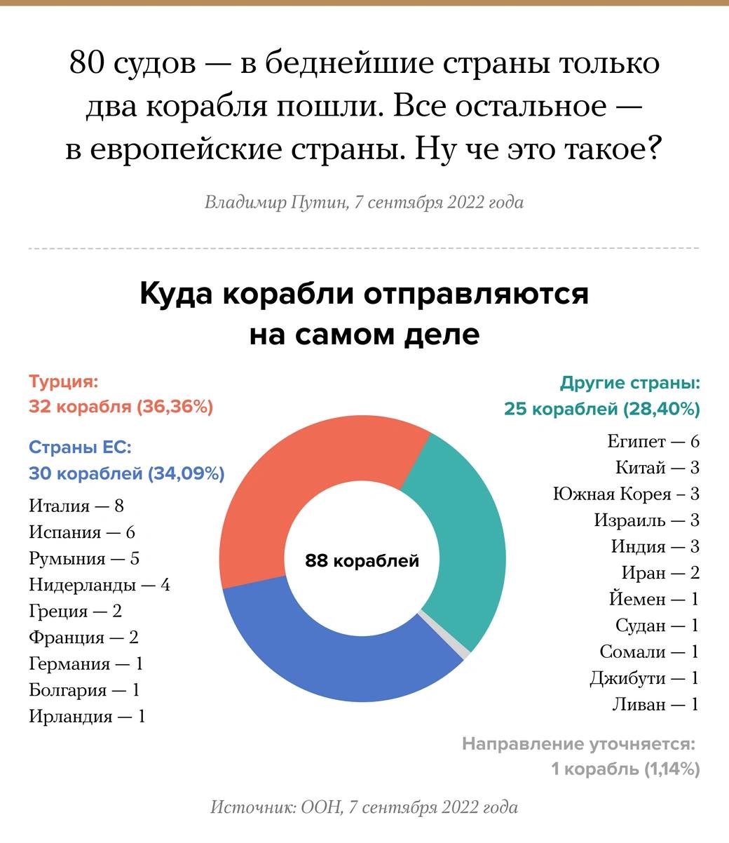 "Как в народе говорят, грубо кинули, надули. И не только нас, но и беднейшие страны под предлогом обеспечения интересов тех, которые все это делают. Это же очевидная вещь. Посмотрите отчеты. 80 судов — два корабля в беднейшие страны только пошли. Все остальное в европейские страны" — заявил Путин в ходе выступления на Восточном экономическом форуме.