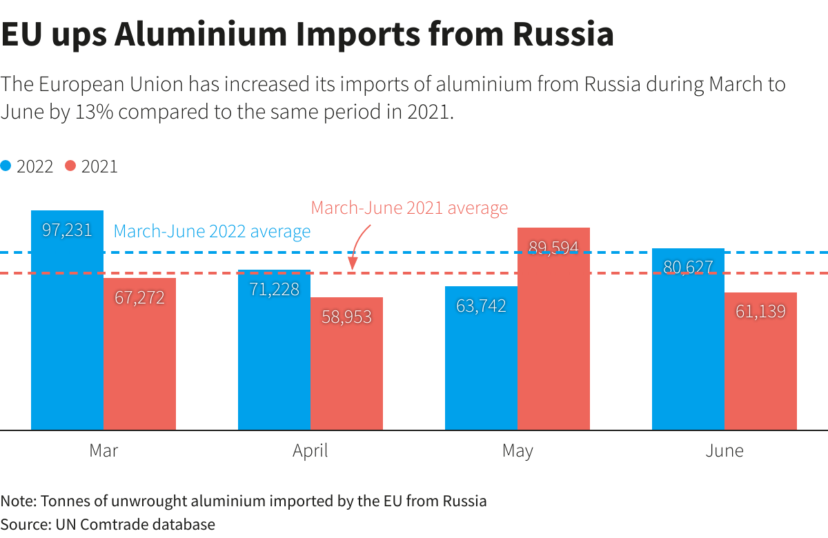 В течение четырех месяцев после вторжения России в Украину ЕС был крупнейшим импортером необработанного алюминия из России, загружая в среднем 78 207 тонн в месяц в марте-июне, что на 13% больше, чем за тот же период в прошлом году.