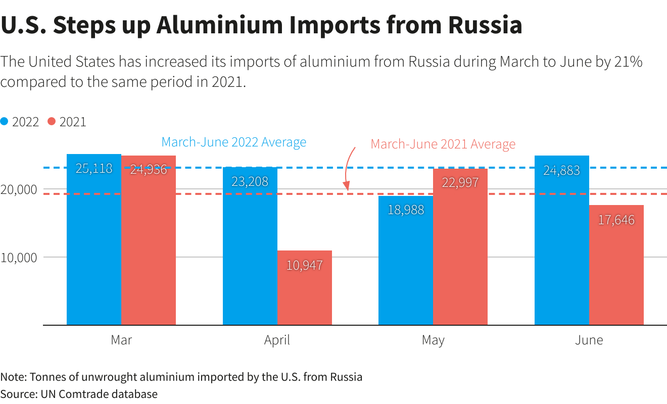 Средний месячный импорт российского алюминия в США в марте-июне составил 23049 тонн, что на 21% больше, чем за аналогичный период прошлого года.