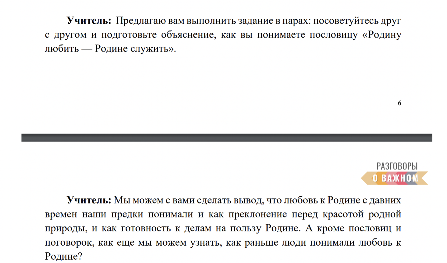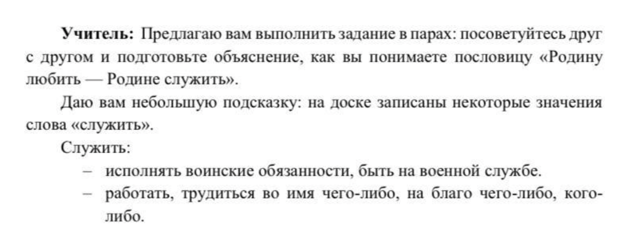 Из сценария к урокам в 3-4 классах исчезла также подсказка учителя с несколькими значениями глагола «служить». По задумке, педагог предлагает ученикам объяснить значение поговорки «Родину любить — Родине служить».