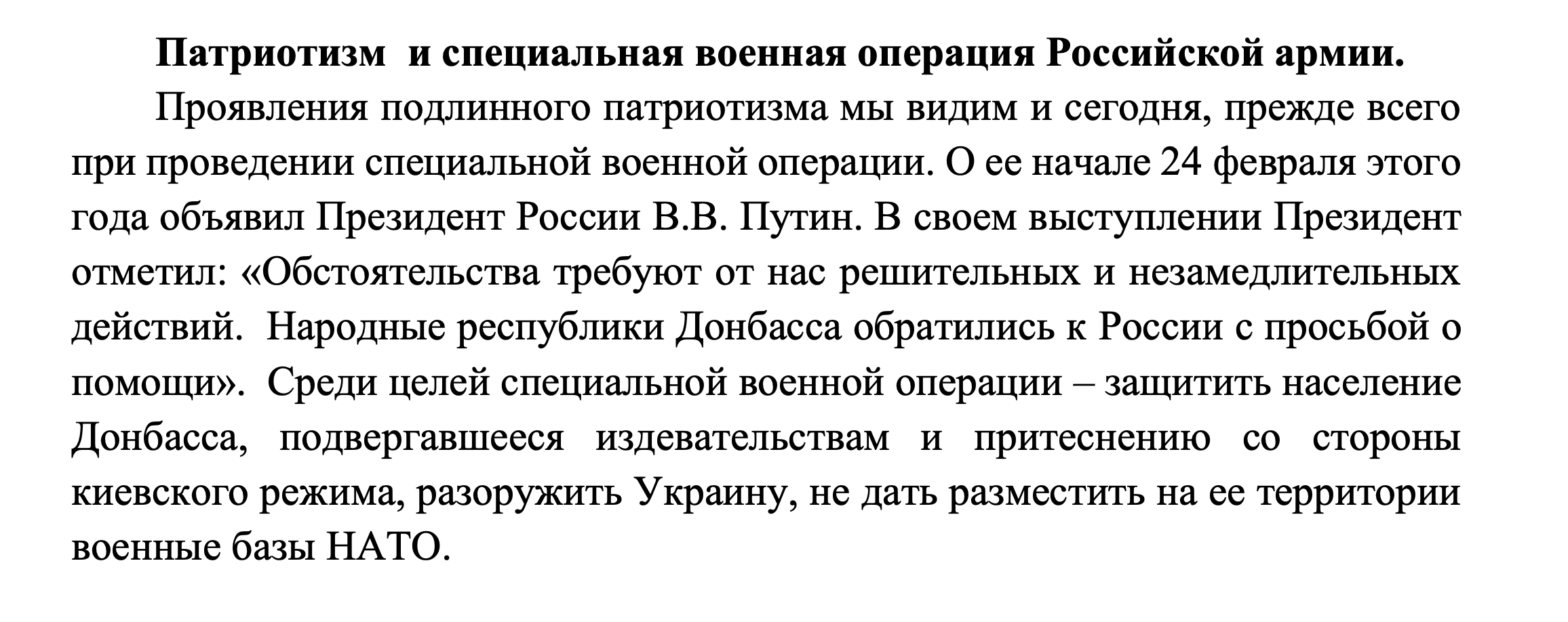 Так, в сценариях к запланированным на 12 сентября урокам «Наша страна — Россия» с 5 по 11 классы исчезла целая глава «Патриотизм и специальная военная операция». В ней приводились цитаты из речи Путина 24 февраля, упоминались «разоружение Украины» и «защита населения Донбасса» в качестве целей «специальной военной операции».