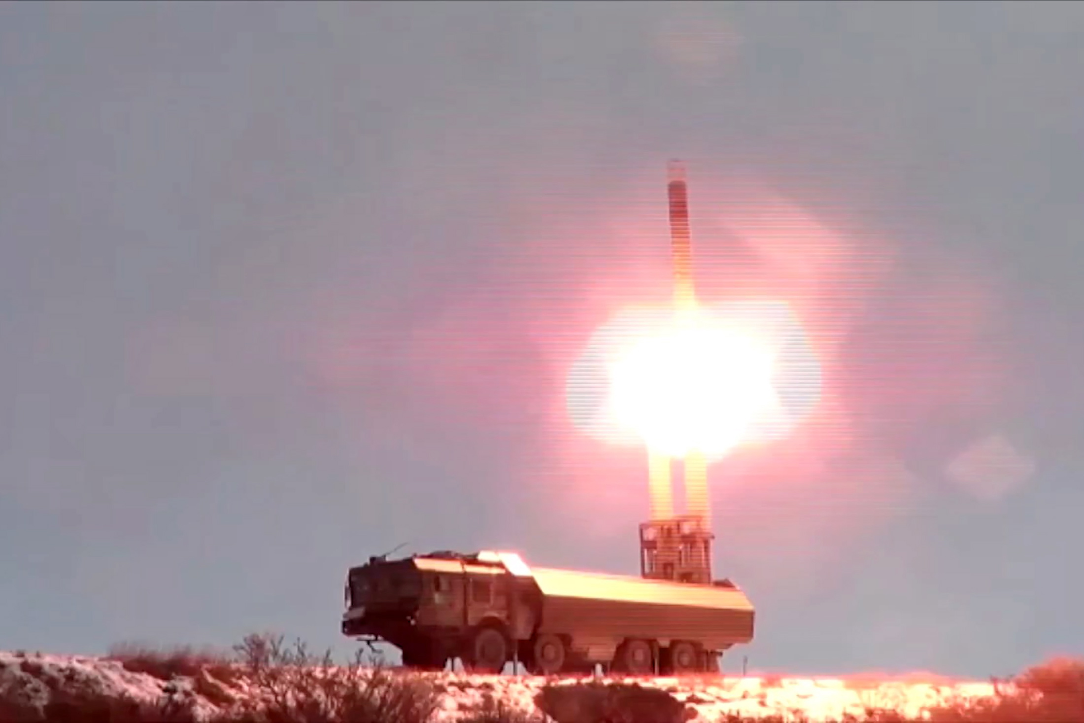 Мобильный комплекс береговой обороны «Бастион-П» производит пуск сверхзвуковой противокорабельной крылатой ракеты П-800 «Оникс»