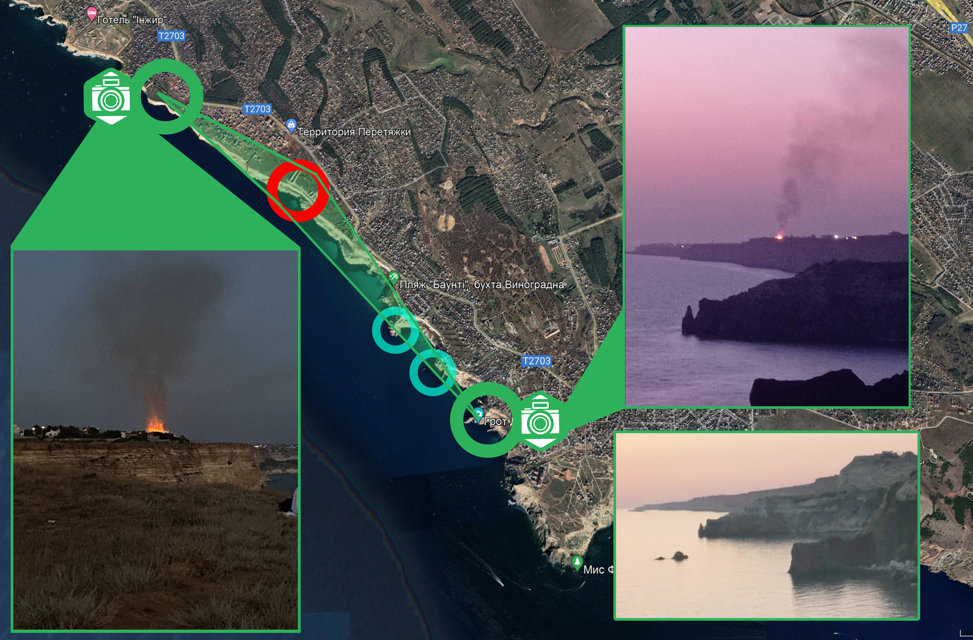 По опубликованным в сети фото нам удалось установить приблизительное место пожара. Если смотреть на северо-запад из грота Дианы, то из него видно то же скалистый выступ, камни в море и Виноградный мыс, как и на фото с пожаром. Согласно ракурсу съемки, место возгорания совпадает с размещением военной базы.