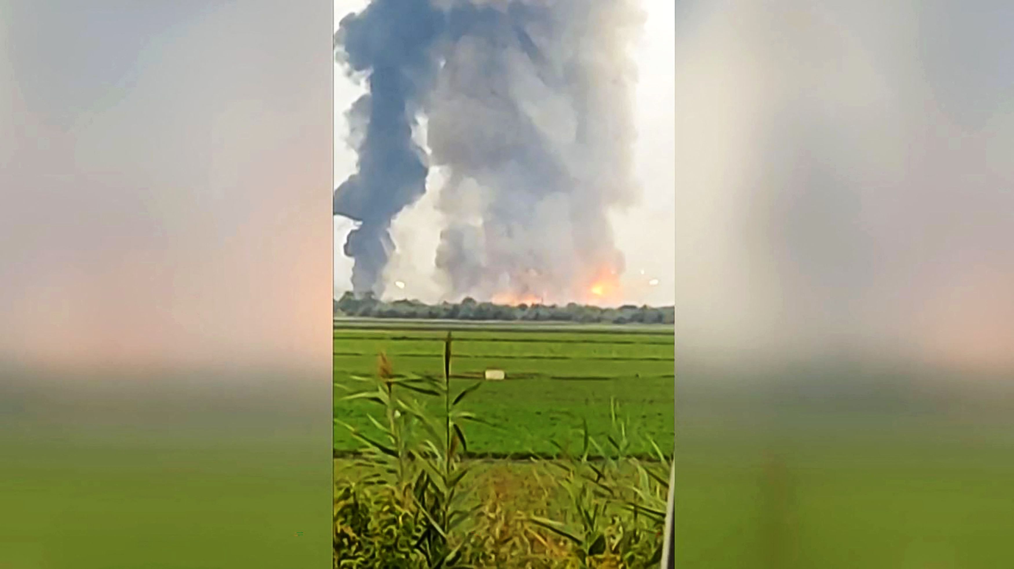 На этом кадре из видео видны взрывы боеприпасов на территории села Майское Джанкойского района. 16 августа 2022 года
